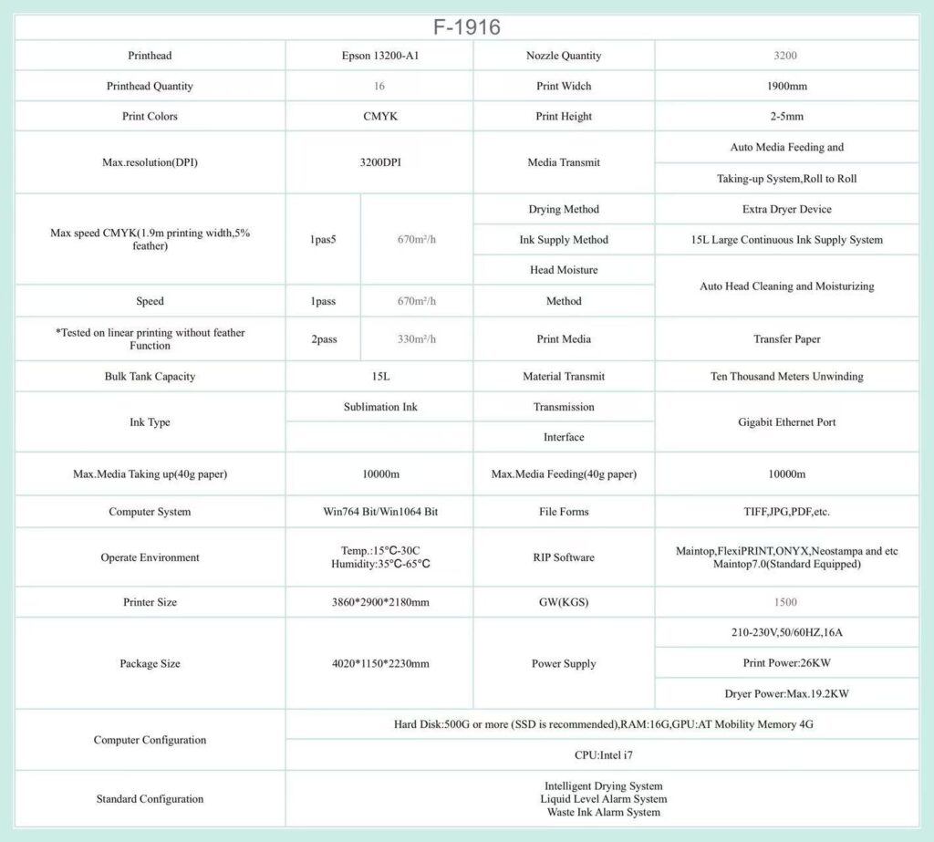Equipped with 16 Epson I3200-A1 printheads, each printhead has 3200 nozzles. It features variable ink droplet technology, resulting in extremely high printing accuracy and color reproduction quality.